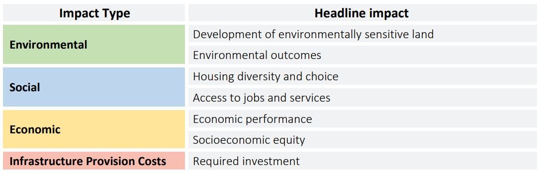 The framework considers the key drivers of the urban development scenarios and the potential flow-on effects while also identifying the exact measures to assess the relative benefits of each scenario as well as the methodology required to undertake the analysis.